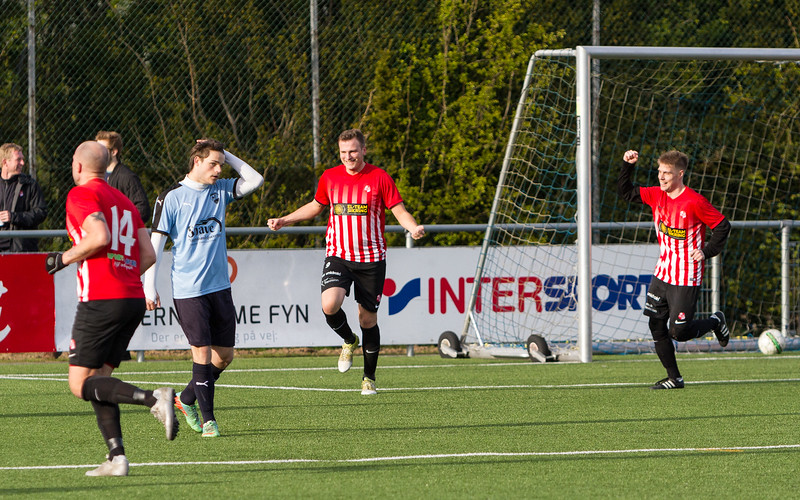 Daniel Hansen har netop scoret til 1 - 0. Thomas Johansen og Andreas Bebe jubler med. Foto af Kurt Bebe.