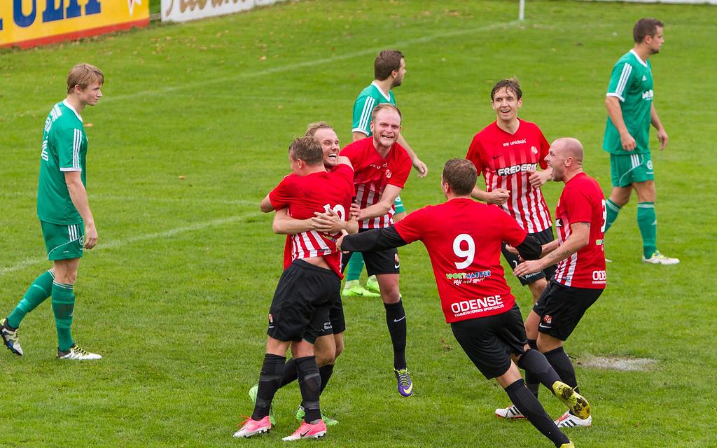 Christian Klingenberg har scoret sejrsmålet i det 88. minut og lykønskes af holdkammeraterne. Foto af Kurt Bebe.
