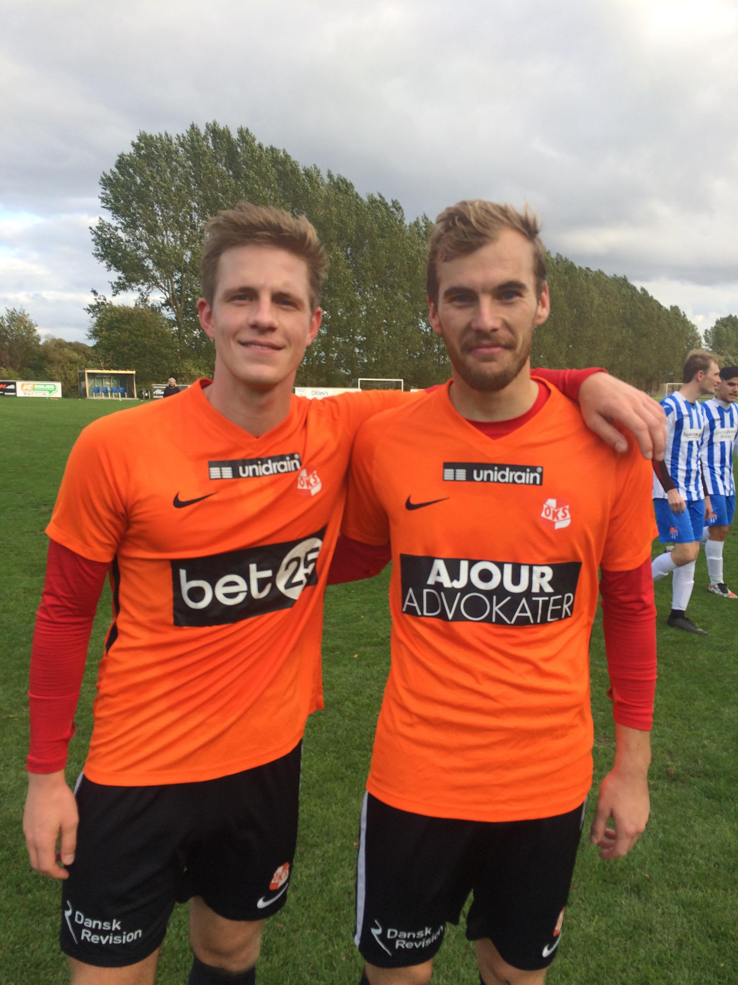 Målscorer Morten Andersen (tv) og Christian Nygaard efter kampen mod Krarup/Espe.