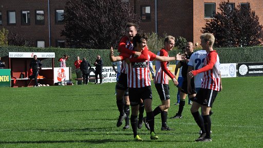 Jannik Pedersen har scoret til 1 - 0 og bliver lykønsket af holdkammeraterne. Foto af Bo Holst Sørensen