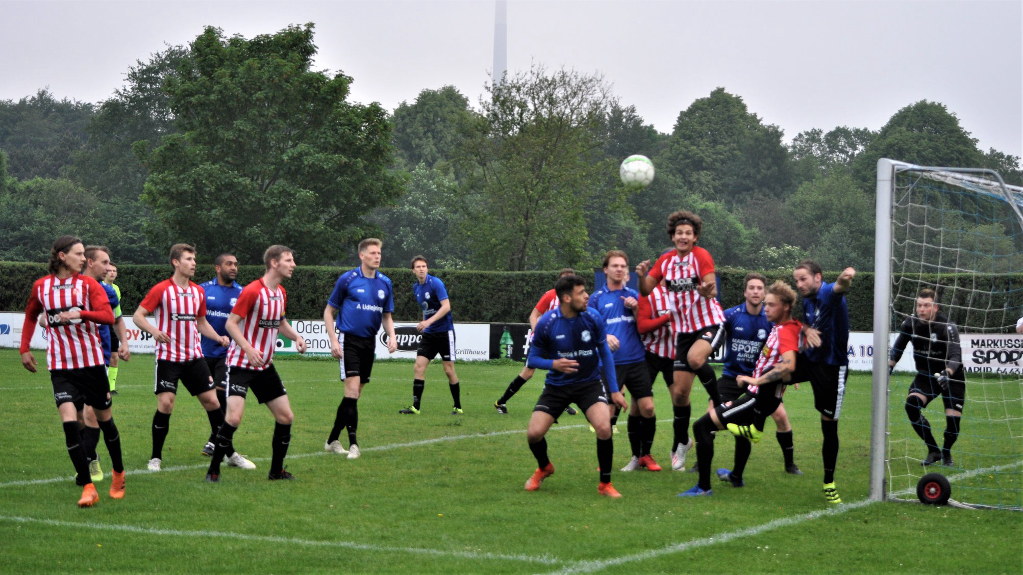 Der var konstant pres på værternes mål. Her er det Jannik Pedersen der når højest, mens Lasse Grønholt, Søren Ilsøe og Christian Wogensen står klar til at gribe ind. Jeppe Algaard er i kamp ved forreste stolpe. Foto af Bo Holst Sørensen