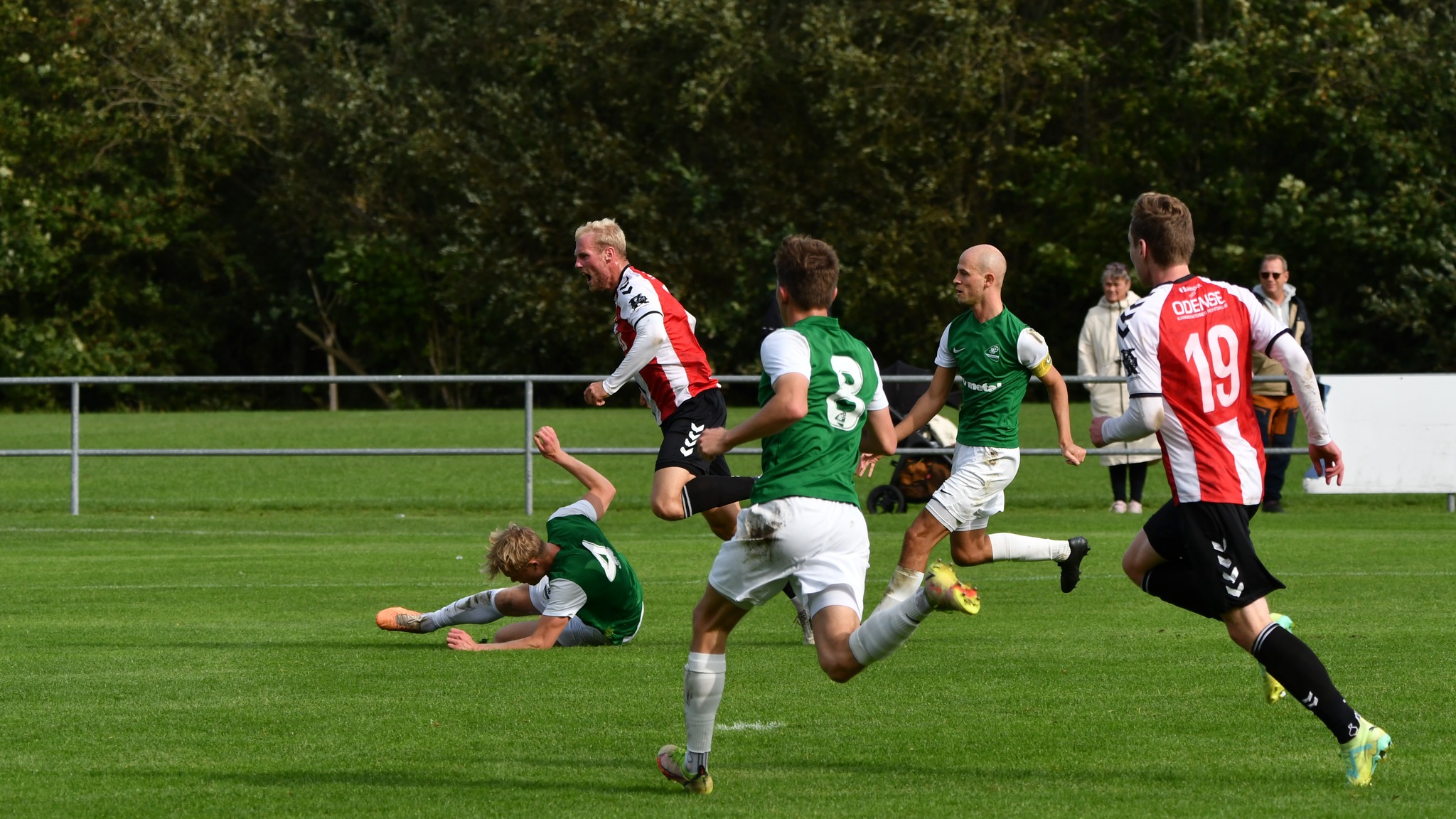I det 27. minut kom så hjemmeføringen. Hjemmeholdets Jeppe Hansen vandt bolden i en duel midt på banen og da dommeren undlod at dømme det frispark, som nok burde have været dømt, fangede den dygtige spiller, OKS-målmand Rasmus Lund langt ude af sit mål og scorede fra 40 meter. Det var godt sparket ind!