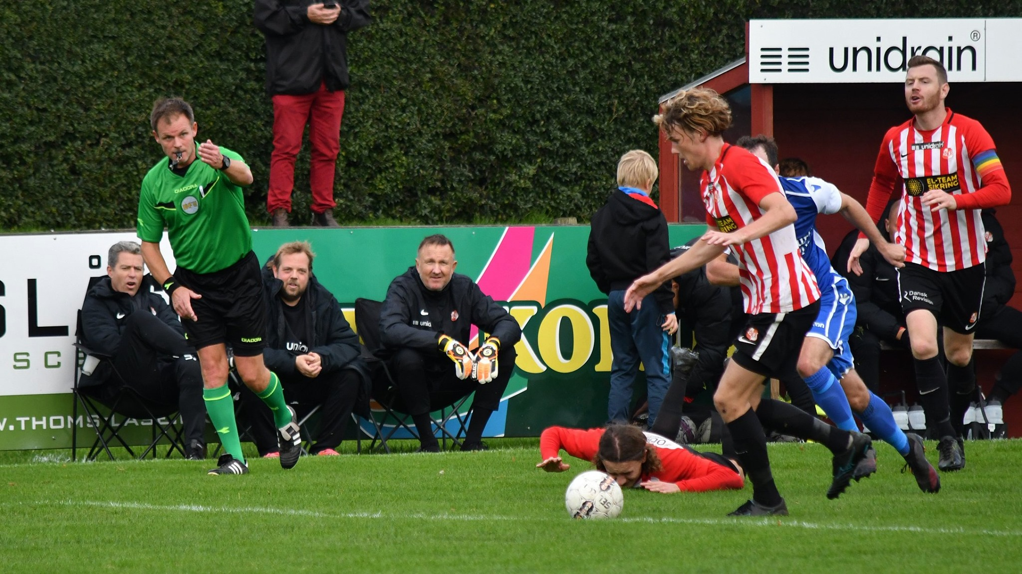 Frederik Klingenberg med bolden følges af anfører Nicolaj Just. Lasse Grønholt er nedlagt, men dommer Thomas Isen tager fordelsreglen. I baggrunden følger OKS bænken engageret med. Foto af Bo Holst Sørensen
