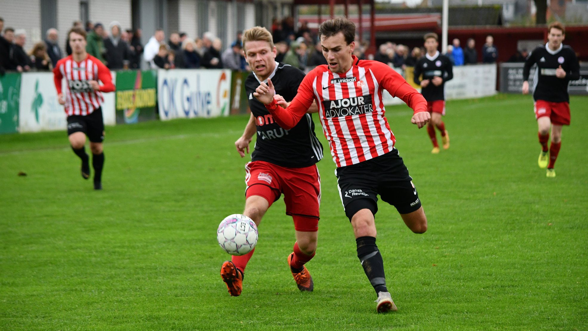 Jakob Mønster i nærkamp med en TPI spiller. I baggrunden ses Nicklas Folke. Foto af Bo Holst Sørensen