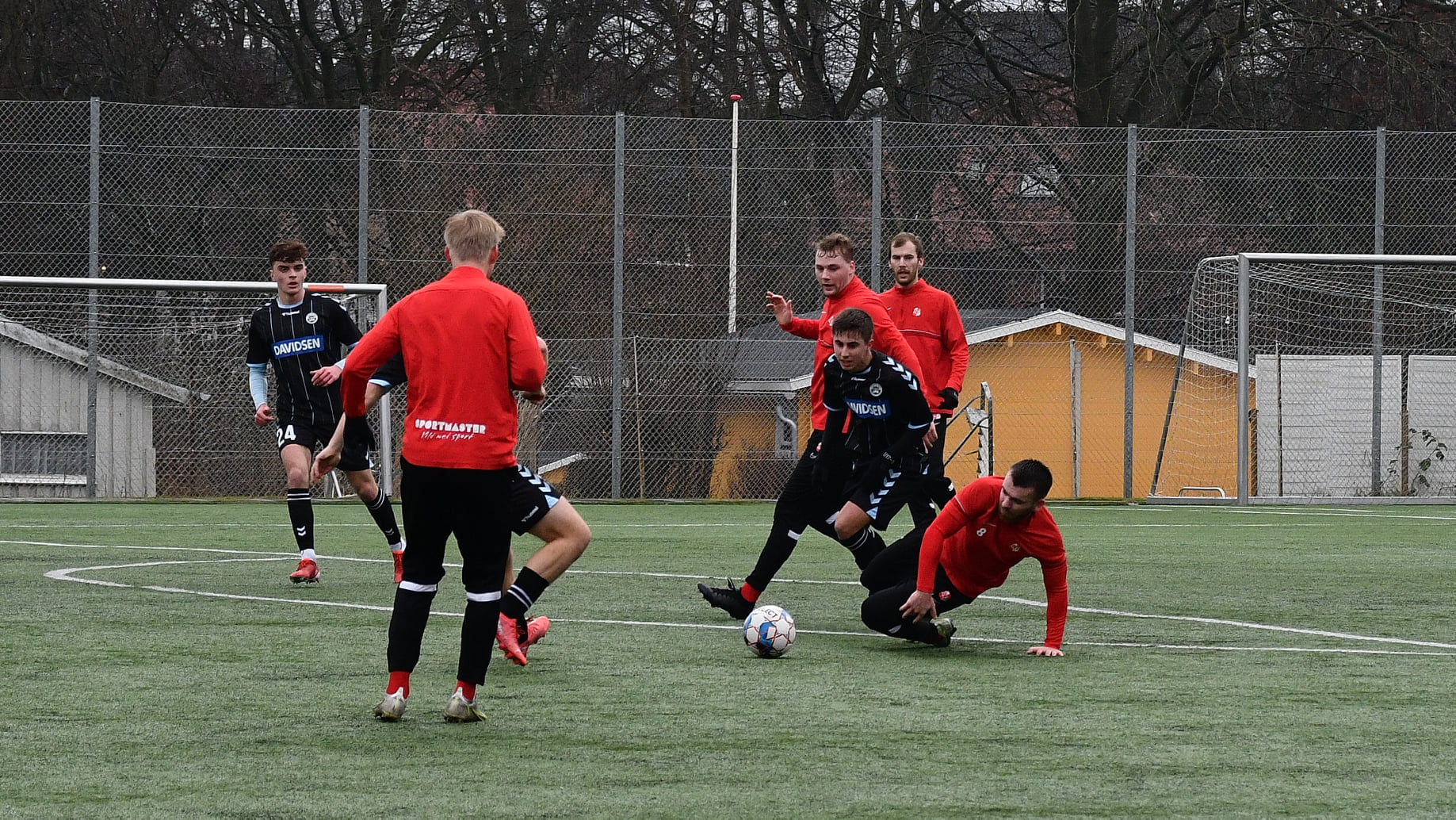 Fra sidste weekends testkamp vs. Sønderjyskes U19 liga hold. Emil Skursch er i kamp om bolden, mens Jeppe Algaard, Christian Nygaard og Niclas Coort (med ryggen til) ser til. Foto af Bo H Sørensen