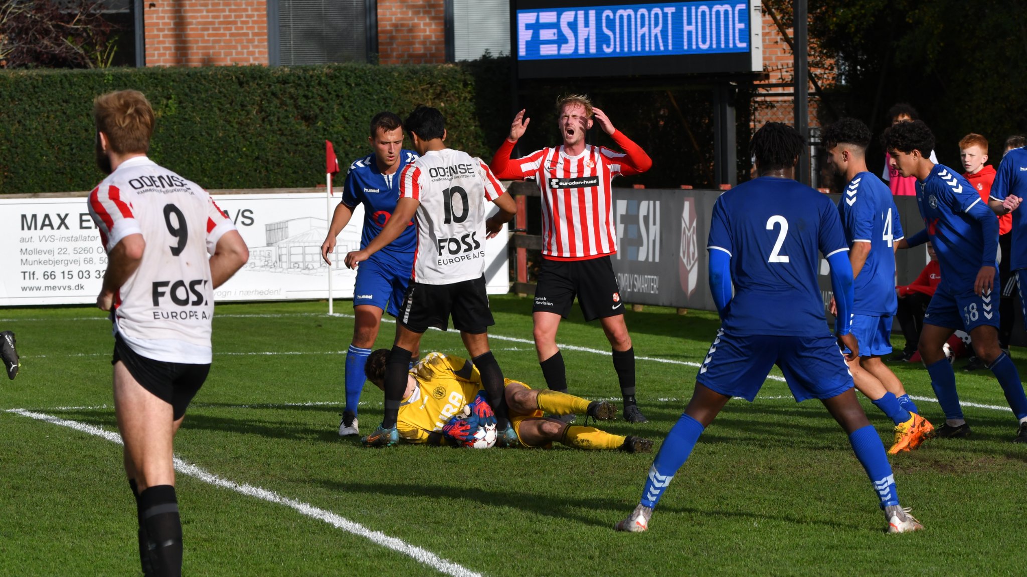 OKS havde mange gode muligheder for at score flere mål end Brabrand. Her er det Ronni Nordnæs der ærgrer sig. Tong og Alexander Mose er også med på billedet, som er taget af Bo H Sørensen.