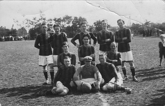 Det første holdfoto? Måske fra banen i Steinsgade? I hvert fald bærer disse OKSer de originale sort- og grønstribede trøjer, man havde arvet fra Den Kommunale Sportsklub. Farverne blev snart ændret til de velkendte rød-hvide striber..og så laver man ikke længere den slags målmands-kasketter!