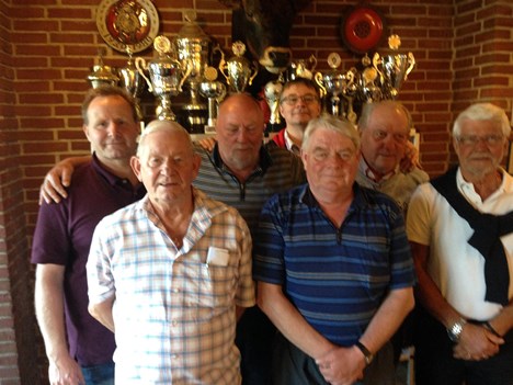 6 æresmedlemmer af OKS, fotograferet i 2015. Forrest Benny Leif Petersen, Peder Blom og Arne Christensen. Bagerst: Henrik "Kleiner" Petersen, Palle Christensen og Johan Schmeltz. Helt i baggrunden daværende formand Michael Mai.