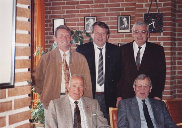5 OKS-formænd fotograferet ved 60-års jubilæet 1990: bagerst Benny Petersen, Johan Schmeltz og Carl-Erik Larsen". Forrest: "Store" Arne Jensen og Kaj "Ex" Nielsen