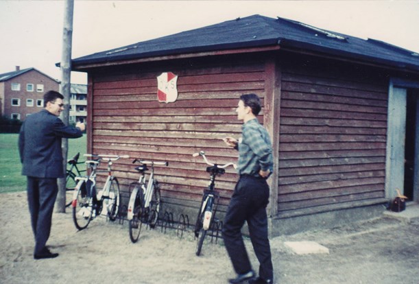 Benny Petersen (th) og Carl-Erik "Lillebror" Larsen foran Det Røde Skur