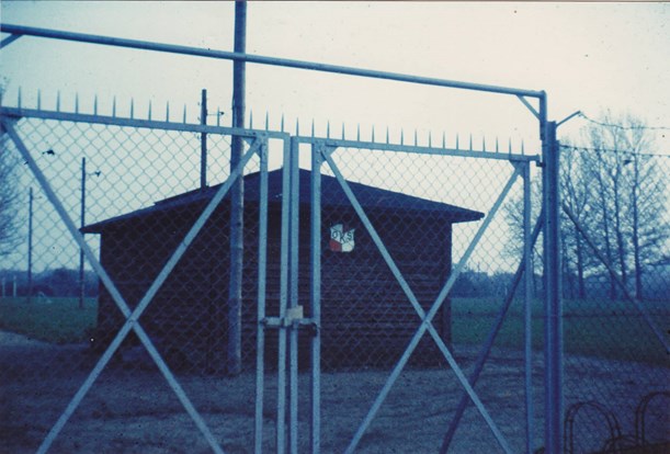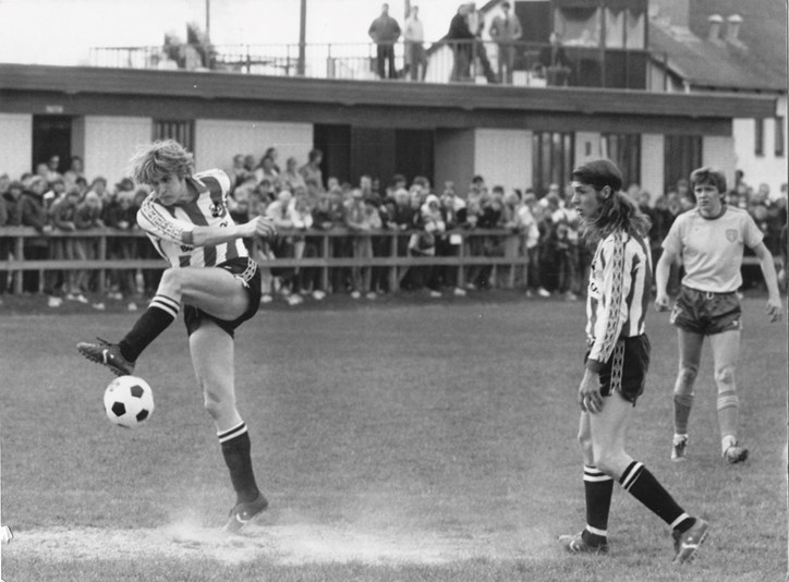 Der kom lyd på kampene, da OKSon Park i 1981 fik etableret højtaleranlæg og Paladset blev tilført en lille speakerboks af træ på taget (bagerst th). Første stadionspeaker på OKSon Park var det senere æresmedlem Benny Petersen. Johnny Andersen (tv) og Niels Møller Christensen forsøger at sætte stadionspeakeren i arbejde med et OKS-mål