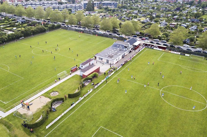 Fuld action på Bane 1 og Bane 2 på Danmarks hyggeligste fodboldstadion, OKSon Park. Foto: Fyens Stiftstidende (2020)