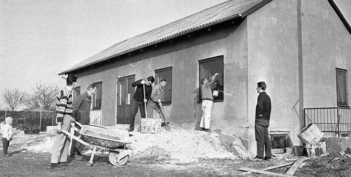 Det Store Hus under opførelse i 1966 af frivillige håndværkere blandt medlemmerne. Foto: Arkiv.dk