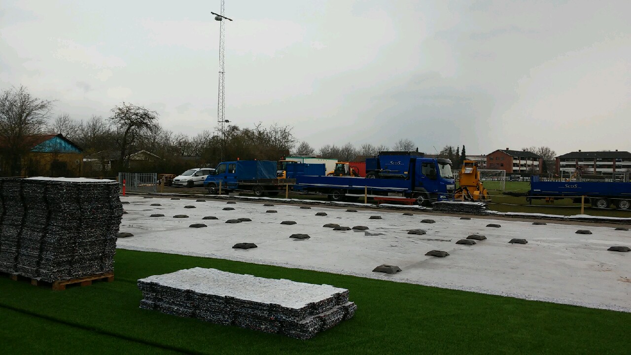 Marius Pedersens' folk er sammen med kunstgræsfolkene fra Sportsbyg, igang med at rette banen op så den står "snor lige" - Det tager et par uger, så er den klar igen.