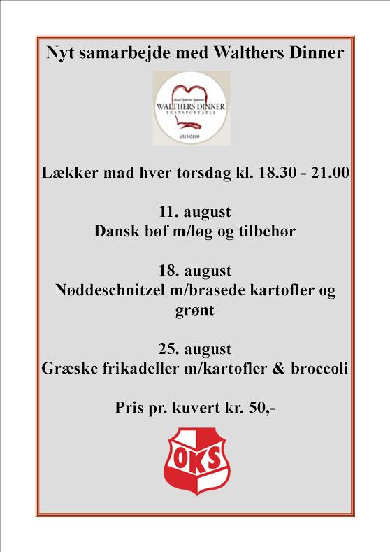 I forbindelse med at bestyrelsen i OKS ser på, hvorledes fremtidens Cafe OKSEN skal forme sig, er der indgået et samarbejde med Walthers Dinner om levering af mad til de populære spisninger torsdag aften.