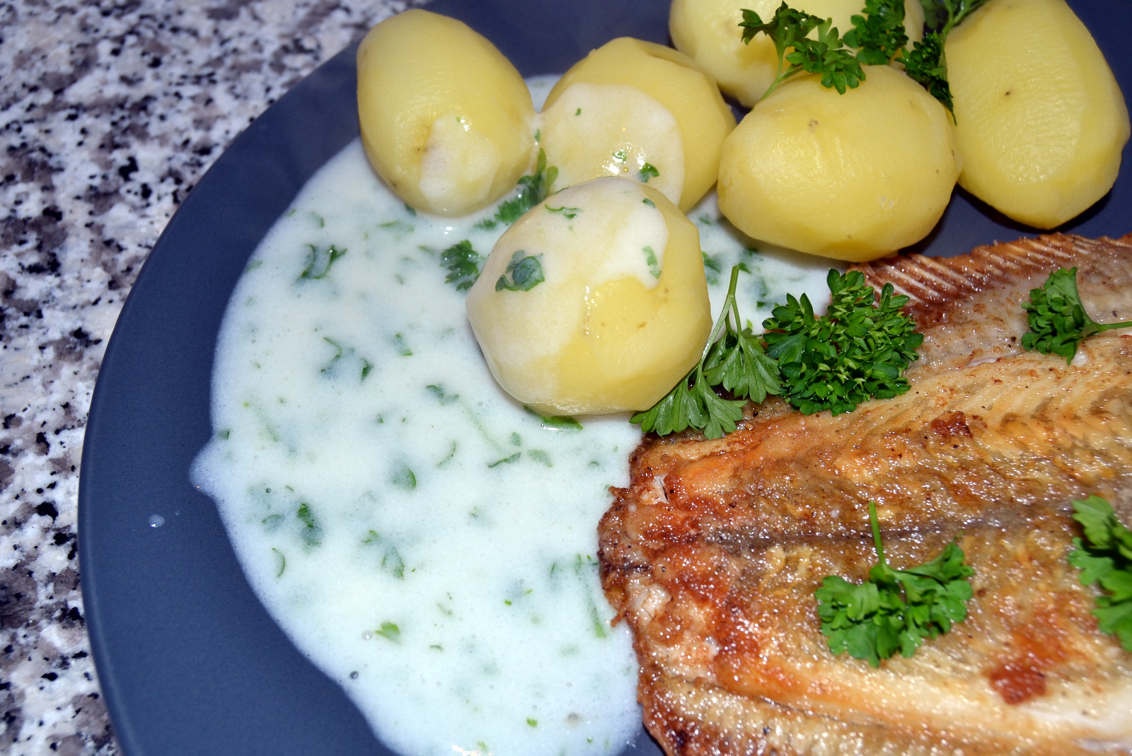 I denne uge skal vi spise panneret fladfisk m/ persillesovs, kartofler og ærter.
