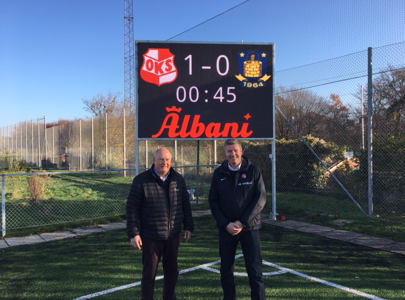 Direktør for Albanifonden, Paul Nissen (t.v.) og OKS formand Klavs Larsen ved den nye LED-tavle ved kunstgræsbanen