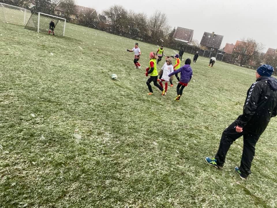Det blev til 1,5 kamp, inden vejret nødvendiggjorde aflysning af resten. Med en imponerende målscore på 9-2 viste holdet sig styrke under alle forhold, da vilkårene jo var ens for alle holdene. Men pigerne blev ved med køre på, og de 2 mål vi inkasserer, er udelukkende en trænerfejl, som opstår da vi sætter 4 nye meget kolde spillere på banen på en gang, for at de ikke skulle stå og fryse, og det bliver straffet med det samme af et modstanderhold som ikke ville vente i kulden på at vi havde skiftet, og det kostede 2 hurtige mål..., men da vi så var blevet afrimet, kommer vi hurtigt med igen og for scoret det vindende mål.