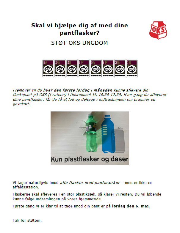 Aflever din tomme pant i klubben, den første lørdag i hver måned og støt OKS ungdom - første gang på lørdag